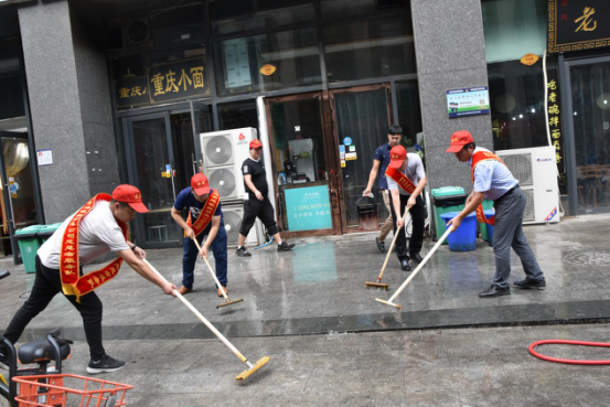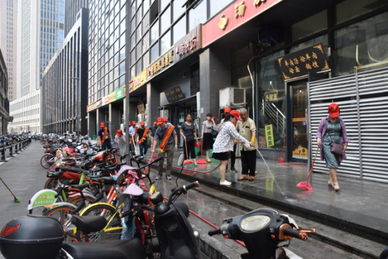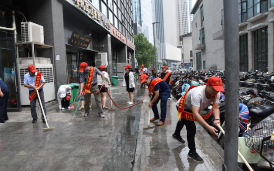 二、“全城清潔”行動(dòng)。清潔家園,黨員志愿者義不容辭。日前,市建投聯(lián)合商務(wù)社區(qū)積極響應(yīng)“全城清潔”行動(dòng)號(hào)召,定期組織志愿者對(duì)社區(qū)單位公共區(qū)域、沿街商戶門店等內(nèi)外環(huán)境進(jìn)行集中整治。7月14日下午,市建投黨員志愿者分赴中國(guó)人保大廈對(duì)沿街商戶門店和街道進(jìn)行集中清理。大清掃活動(dòng)采取包干打掃、分頭行動(dòng)的方式,集中對(duì)沿街商鋪門店垃圾桶(池)、地面污漬等進(jìn)行清洗,全面清理整治各類衛(wèi)生死角,清理積存垃圾,杜絕垃圾亂堆亂放。烈日炎炎,市建投黨員志愿者們絲毫不懼37度的高溫,頭戴小紅帽,戴著紅袖標(biāo),以高度的敬業(yè)態(tài)度和為人民服務(wù)的無(wú)比熱情,全身心投入到環(huán)境衛(wèi)生清理中,通過2個(gè)小時(shí)的辛苦勞動(dòng),使人保大廈沿街門店商鋪和街道面貌煥然一新。