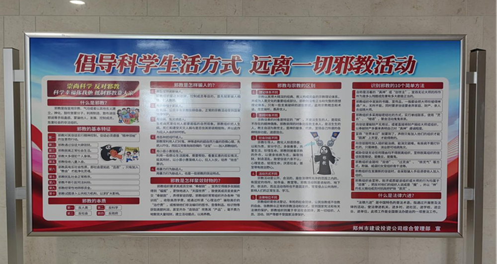 為了進(jìn)一步提高國企員工反邪教意識,認(rèn)識邪教的危害,切實(shí)增強(qiáng)自覺抵御邪教侵蝕的能力,營造積極向上、健康和諧的工作氛圍。4月25日下午,鄭州市建設(shè)投資集團(tuán)有限公司組織全體干部員工開展反對邪教宣傳活動。利用PPT宣講、宣傳展板、網(wǎng)站、懸掛橫幅等方式,向員工宣傳邪教的種類、危害和邪教組織的種類等,引導(dǎo)國企干部職工認(rèn)清邪教本質(zhì),提高識邪、防邪、拒邪能力,筑牢反邪教思想防線,做到對邪教歪理邪說不聽、不看、不信、不傳。